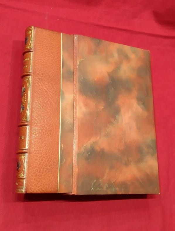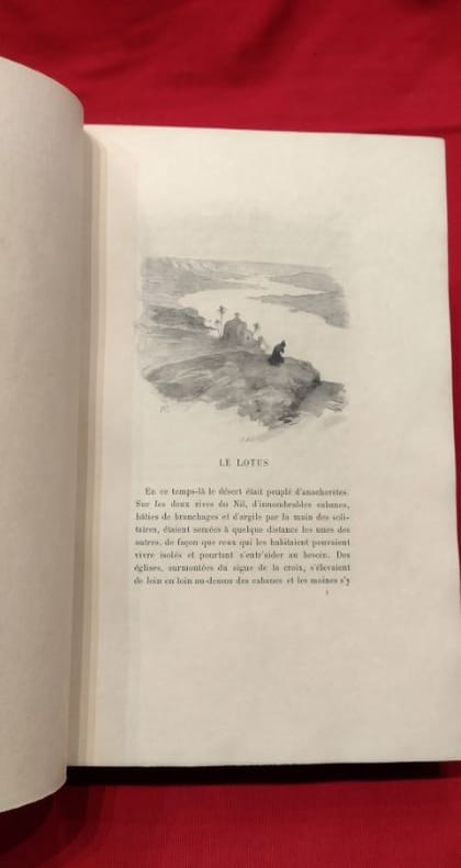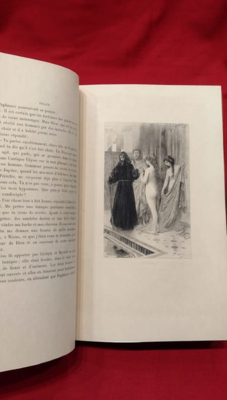 Ce roman fut publié dans la Revue des Deux Mondes en 1899, puis édité chez Calmann-Lévy en 1890. Il conte la vie de Thaïs, une belle courtisane du IVème siècle officiant à Alexandrie et dont la renommée était importante. Le moine Paphnuce parvint à la convertir au Christianisme, mais la beauté de la pécheresse hanta son coeur. Le réalisme, souvent cruel, du trait de Raphaël FREIDA, est ici magnifié. Ce roman inspira Jules Massenet dont il tira son célèbre opéra "La Méditation de Thaïs". Les gravures ont été tirées à la presse à bras par Leblanc et Trautman. Tirage limité à 781 exemplaires. Un des 700 exemplaires sur Vélin de Rives. Usures et petites déchirures à l'étui, infimes usures à la couverture. "Edition recherchée" (Carteret IV, 171 ; Monod 4960).