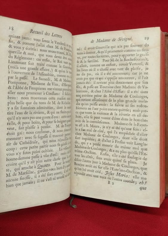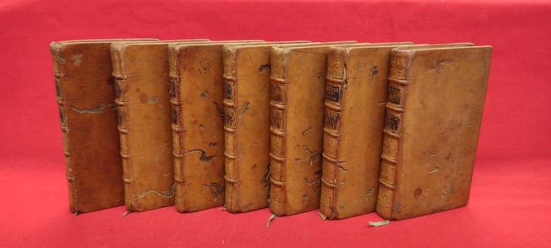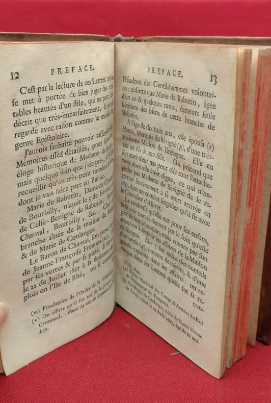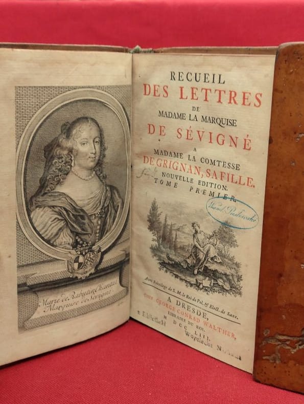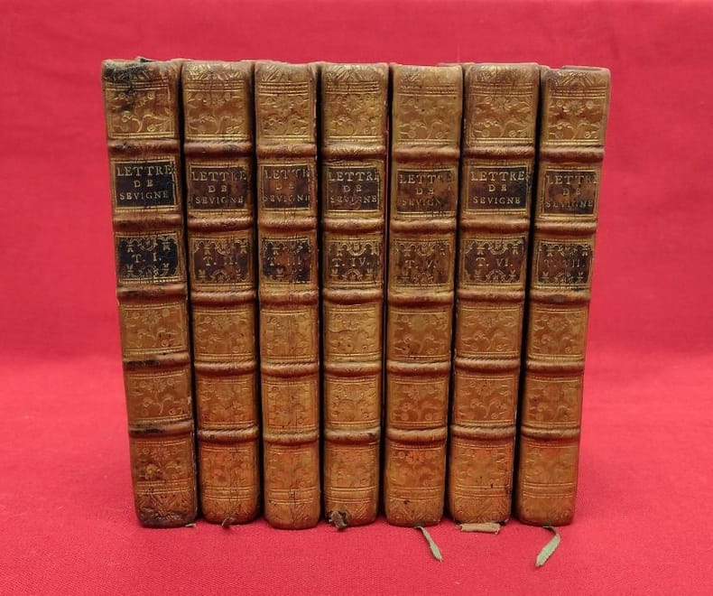 dresde George Conrad Walther 1753 7 A Dresde, chez George Conrad Walther, libraire du roi, 1753, 7 volumes petit in-8 de 95x160 mm environ, 344 - 372 - 366 - 336, (12) ff. (table) - 382 - 387, (13) ff. - 391, (3) ff., complet du portrait de la comtesse de Ségur en frontispice. Plein veau, dos à cinq nerfs portant titres et tomaisons dorés, caissons ornés, roulette dorée sur les coupes, tranches rouges, joli papier dominoté floral en gardes (sans signature). Trois coiffes accidentées, important travail de vers sur les plats, deux ex libris tamponnés sur les pages de titre, traces de mouillures marginales sur les premiers feuillets du tome I, sinon bon état général.