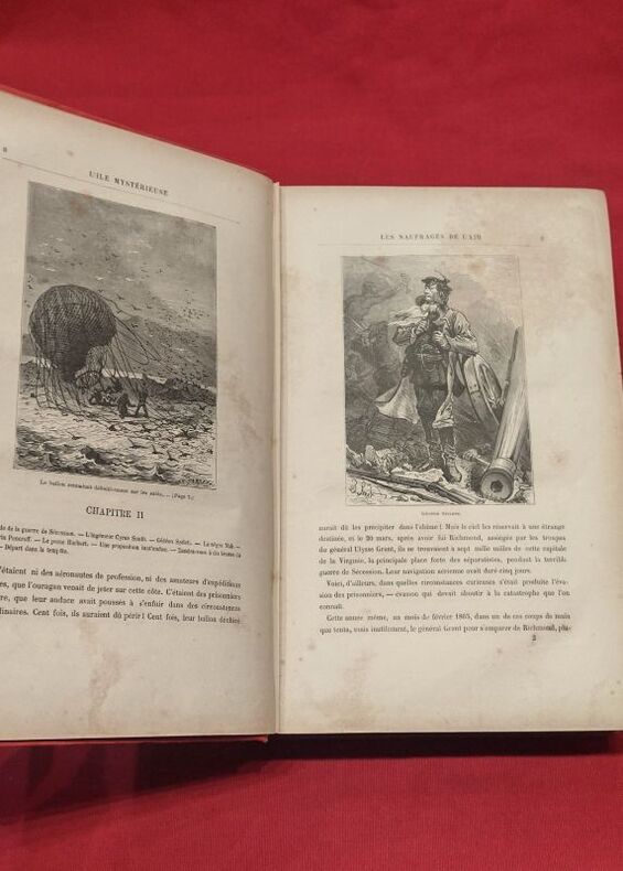 Paris, J. Hetzel et Cie, (1885 ?) Royal8vo. Orig. full pictorial red cloth. Gilt spine, gilt covers. Light wear to spine ends. Corners a bit bumped. All edges gilt. Frontcover with balloon, elephant and paddle-steamer. Frontcover signed A. Souze"". Half-title with illustration on verso. On verso of title-page portrait of Jules Verne. 616 pp. + Publisher's Cat. (8) pp. (Catalogue C R). The catalogue mentions books prepared for 1886, so this must be printed before. A few brownspots. Last leaf with a bit offsettings. Halftitle with brownspots.