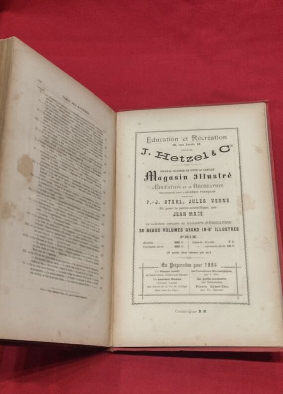 hetzel 1884 cartonnage polychrome Hetzel Editeur, Bibliothèque d'Education et de Récréation, Les Voyages Extraordinaires, [sans date, 1884], 1 volume de 280x185 mm environ, faux-titre, page de titre, 616 pages, 4ff. catalogue (BR), illustré de 154 dessins par Férat. Cartonnage rouge à la bannière verte et aux plats biseautés, de type 6, second plat de type e1 (macaron circulaire noir avec décor d'entrelacs et 16 petites rosaces noires), tranches dorées. Discrets frottements sur la bannière, coins frottés, minimes accrocs sur les mors, des rousseurs, sinon bon état général. Rare alliance de couleurs.