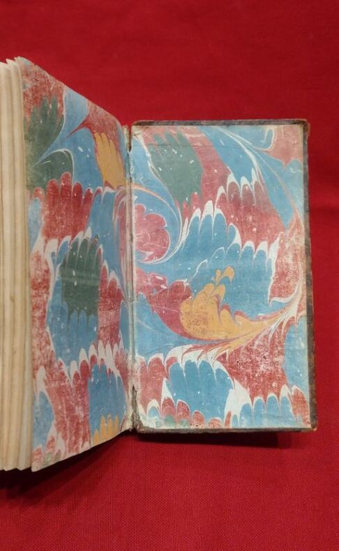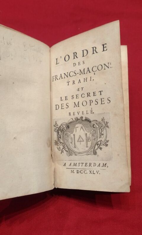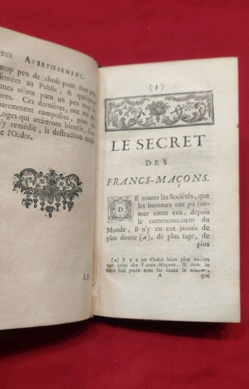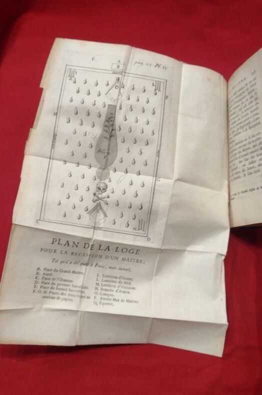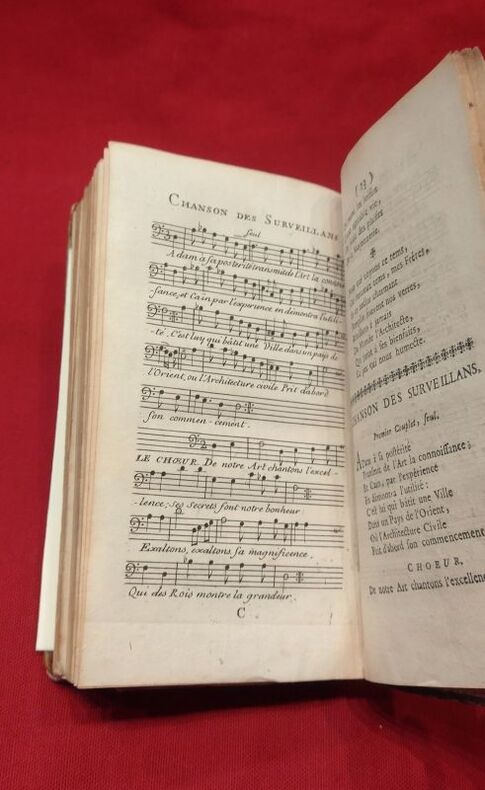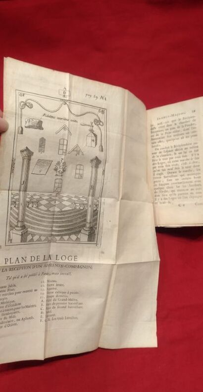1745 in-12 A Amsterdam, 1745, 1 volume in-12 de 95x160 mm, XXX, 240 pages, (1) f. vierge, 34 pages. Complet des 9 planches et des 5 planches de musique, enrichi de curieuses et belles figures maçonniques. Plein veau marbré, dos lisse, titre doré sur pièce de cuir rouge, caissons ornés, roulette dorée sur les coupes, tranches mouchetées de rouge, gardes de papier marbré à la feuille de chêne. Reliure solide mais présente des défauts (coiffe de tête absente, coiffe de queue abimée, coupes et coins frottés, mors internes en partie visibles), un papier avec inscriptions manuscrites collé sur la garde volante, rousseurs éparses, minimes déchirures sans manque, sinon bon état général pour ce livre peu courant.