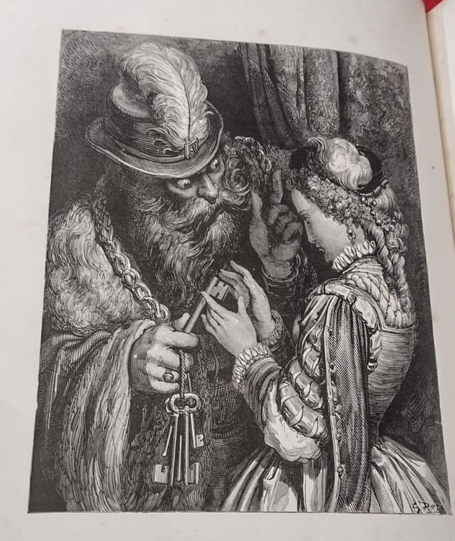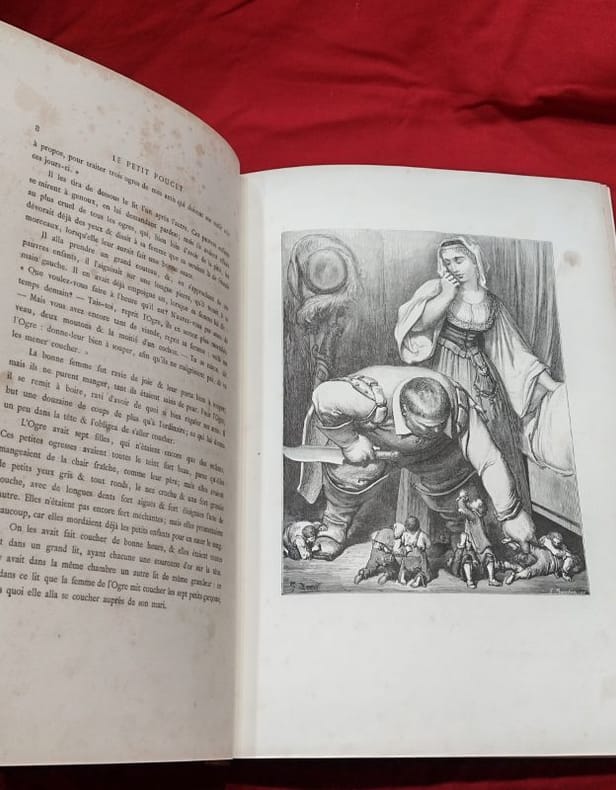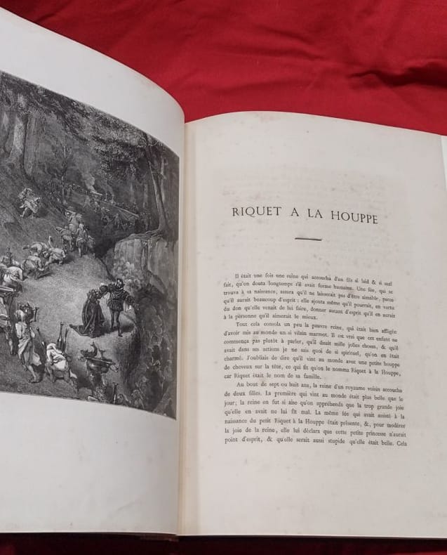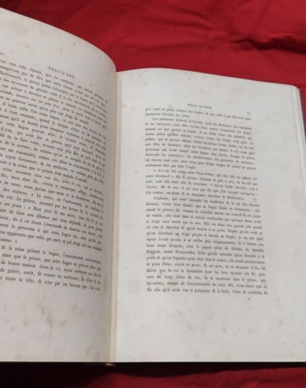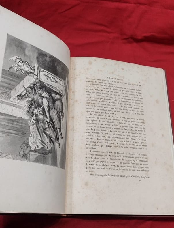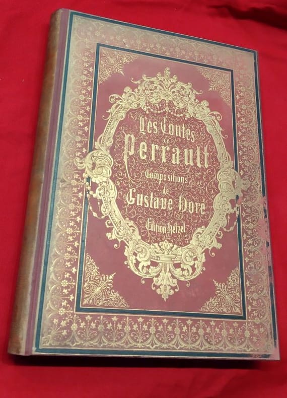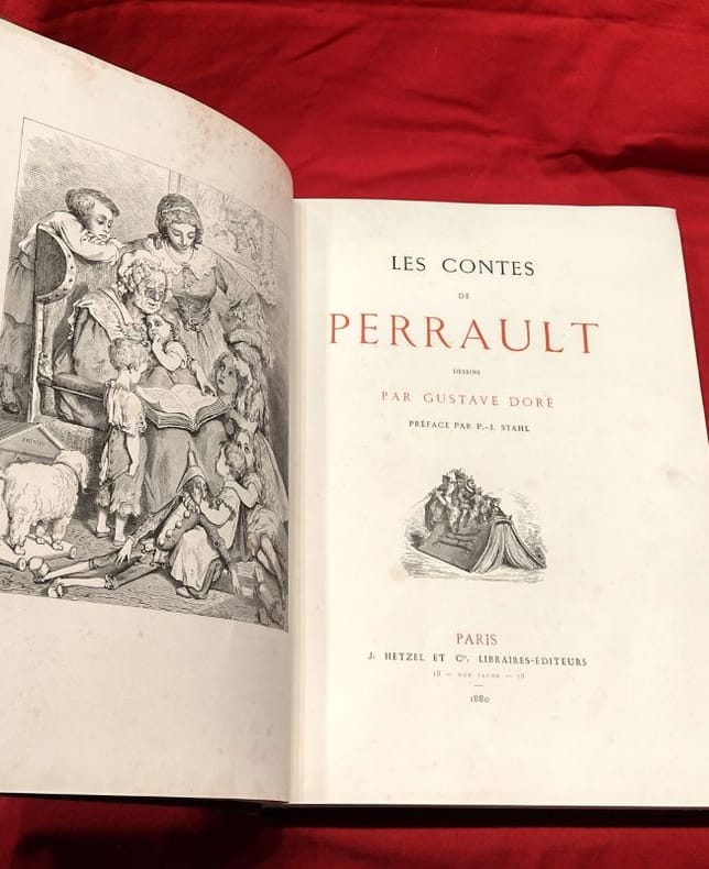paris Hetzel 1880 in folio cartonnage éditeur percaline Paris, J. Hetzel et Cie, 1 volume in-folio de 270x385 mm environ, XXV, 132 pages, 1 frontispice et 37/39 planches (2 planches manquent à Peau d'âne), incomplet. Cartonnage de l'éditeur signé Lenègre et A. Souze SG, pleine percaline rouge, dos portant titres et décors dorés, premier plat orné d'un double encadrement noir d'une frise et d'un décor dorés, important médaillon central au milieu duquel figurent les titres, frise d'encadrement noire au second plat frappé en son centre d'un médaillon noir. Cartonnage restauré, pages de gardes remplacées, ors du dos et de la frise au premier plat affadis, second plat décoloré, des rousseurs, néanmoins bon état général, cela reste un bel exemplaire.