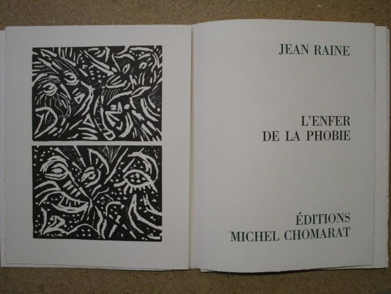 Michel Chomarat 1990 Editions Michel Chomarat, feuillets libres sous chemise, 1990, environ 39x31cm, exemplaire nominatif numéroté 171/175 sur Vélin Arches, 12 linos gravés par Jean Raine (dont 10 en pleine page). Très bon état.