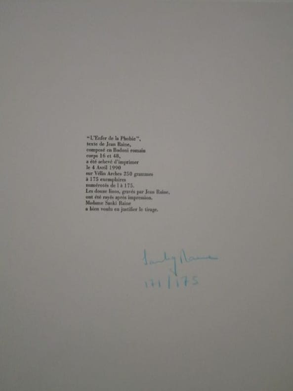 "Les douze linos originaux de Jean Raine, gravés en 1976 (répertoriés sous les numéros 658 à 667 dans le catalogue raisonné de son oeuvre, publiés aujourd'hui pour la première fois, étaient initialement destinés à un projet de livre avec Marcel Broodthaers. La disparition de ce dernier, survenue à Cologne le 18 janvier 1976, ne permit pas de faire aboutir ce projet.""Les douze linos, gravés par Jean Raine, ont été rayés après impression." Merci de nous contacter à l'avance si vous souhaitez consulter une référence au sein de notre librairie.