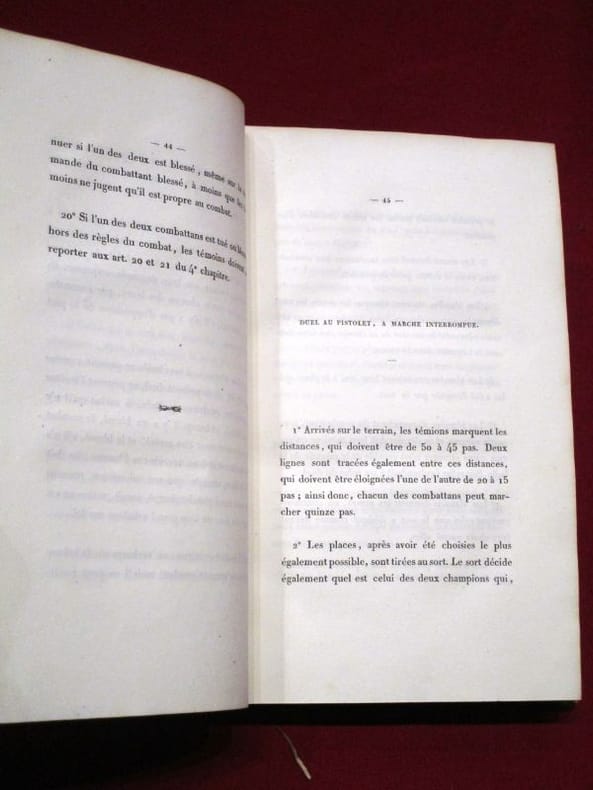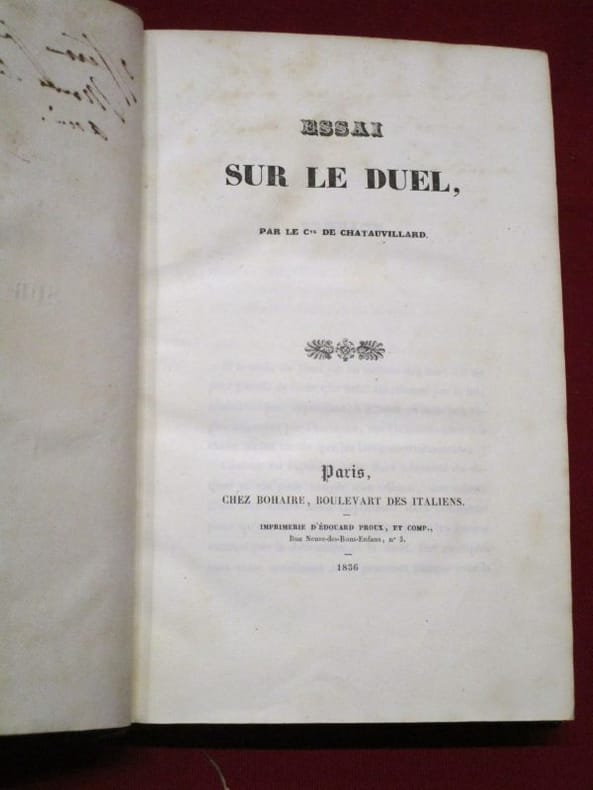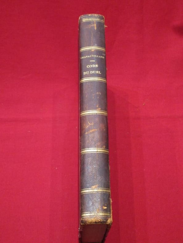 Édition originale. Important ouvrage proposant un règlement officiel et rationnel sur la conduite des duels, dont la tradition s’était réveillée avec le nouvel élan romantique. Le comte de Chateauvillard (1799-1869), connu pour sa vie mondaine, justifie ainsi son travail : " l'honneur n'est pas chose moins sacrée que les lois gouvernementales." Le livre s'articule autour de six grandes parties : Code du duel, Noms des personnes honorables qui ont bien voulu adhérer au présent Règlement sur les duels, Commentaires sur le Traité des duels, Dissertations et anciennes lois sur les duels, Nomenclatures des lois et arrêts des cours souveraines, et enfin Recueil des édits et arrêts sur les duels.Bibliographie : Bel exemplaire malgré quelques taches sombres à la reliure. De la bibliothèque de Louis Lanoizelée (1896-1990), bouquiniste et écrivain ayant aussi goûté aux métiers de domestique de ferme, de mineur ou de maître d'hôtel. Il est notamment l'auteur d'une monographie intitulée Les Bouquinistes des quais de Paris, parue en 1956, couronnée par l'Académie française.