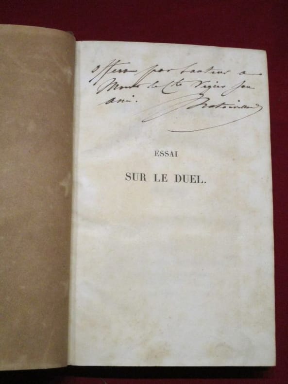 "Édition originale de cet essai de droit libéral sous l'égide de la Charte. Gastronome, Jean Anthelme Brillat-Savarin (1755-1826), est avant tout homme du droit, avocat de formation, qui fit carrière comme conseiller à la Cour de Cassation. C'est en juriste qu'il livre ici son opinion sur la question du duel : ""Il ne s'agit pas de décider si le duel est une chose bonne, licite, ou morale en soi […] mais seulement d'examiner si les faits qui constituent un duel sans déloyauté, sont qualifiés et punis par nos lois actuelles "". Remontant aux sources, l'auteur présente l'histoire du duel depuis les temps féodaux jusqu'à la législation répressive du Code pénal de 1810 avant d'exposer la situation contemporaine. Brillat-Savarin, en magistrat libéral se prononce résolument contre l'idée de légiférer à nouveau sur les duels, affirmant qu'il faut plutôt chercher leur diminution progressive ""au moyen de l'opinion publique"" : ""c'est à tous ceux qui dirigent cette opinion, au roi […], aux chefs de corps […], aux écrivains […], aux théâtres […], de se réunir pour attaquer le duel par les armes combinées de l'autorité, de la moral en de la raison, et même du ridicule […]"". Remarquable exemplaire enrichi d'un billet autographe signé par André Dupin (1783-1865), inamovible procureur-général près la Cour de cassation, sous la Monarchie de juillet puis l'Empire, à François Sauvo, directeur du Moniteur universel . Cette courte missive, indiquant avoir relevé trois erreurs dans le compte rendu de son discours publié dans le journal, accompagne l'Arrêt rendu par la Cour de cassation […] à l'audience solennelle du 15 décembre 1837 sur la question des duels. Cette publication ""imprimée par ordre de la Cour"", comprend deux parties, le Rapport de M. le conseiller Bérenger, suivi du Réquisitoire de M. le procureur-général Dupin. La Cour de cassation avait été saisie à la suite d'un jugement de la cour royale de Bourges confirmant ceux de la Cour royale d'Orléans après le tribunal de Tours, en faveur du non-lieu pour un homme ayant, à la suite d'un duel à l'épée, tué son adversaire. Rappelant que les codes successifs de 1791 et de 1810 ne mentionnaient plus spécifiquement le duel mais condamnaient évidemment l'homicide, le Rapport indique que les juges en avaient tiré deux interprétations juridiques divergentes : tuer ou blesser son adversaire dans ce type d'affrontement devait être puni comme tout autre homicide, ou a contrario, le législateur n'ayant pas inclus spécifiquement le duel dans le code, le vainqueur d'un combat létal pouvait échapper aux poursuites. À la suite du Rapport, le Réquisitoire de Dupin réaffirme avec force la jurisprudence de la Cour de cassation en faveur de la première lecture. On trouve enfin, relié à la suite, une pièce imprimée par Pain, au Palais-Royal, relatant le Grand duel Arrivé aujourd'hui, 11 Août [1791], au Bois de Boulogne; entre Messieurs Cazalès et Barnave Députés de l'Assemblée Nationale. À l'issue de cette rencontre, le député royaliste Jacques Antoine Marie de Cazalès (1758-1805), duelliste récidiviste et malheureux, à l'épée comme au pistolet, avait été blessé par balle. Très bel exemplaire en élégante reliure du temps."