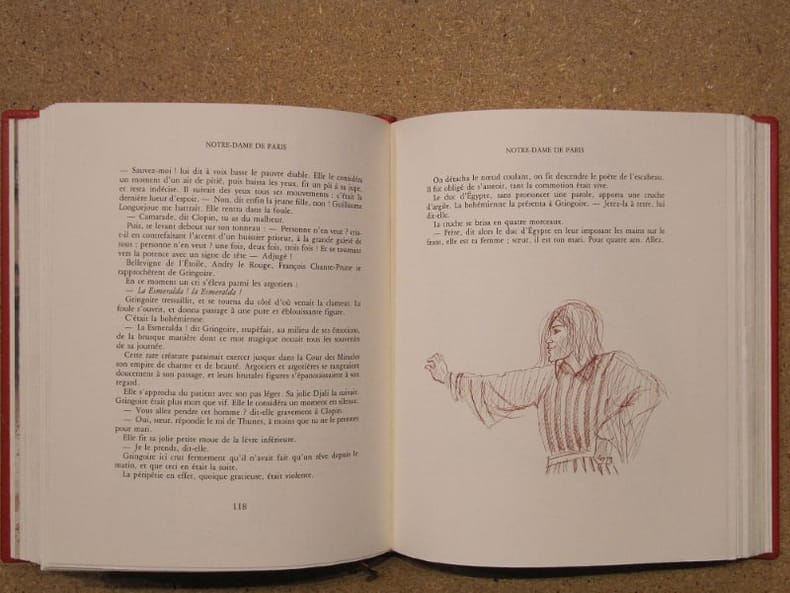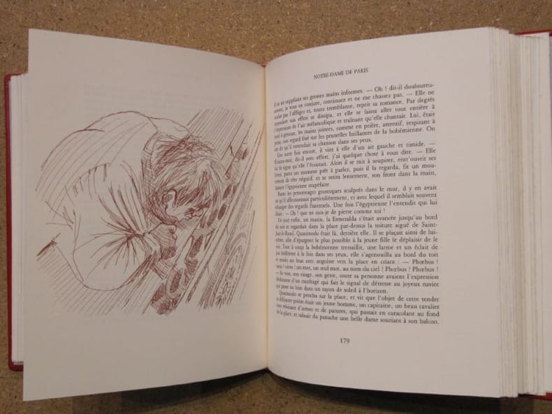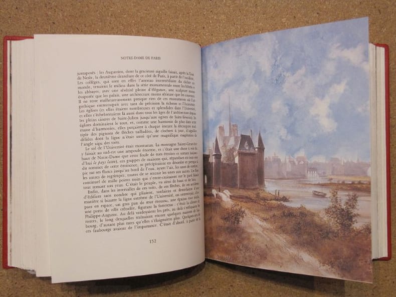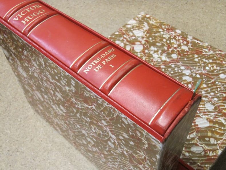 Paris, 1 demi chagrin 352 [p.p] L'INCARNATION ULTIME DU GÉNIE HUGOLIEN : QUAND L'AUTEUR DEVIENT ILLUSTRATEURPosséder une édition de Notre-Dame de Paris est un classique. Posséder cette édition est un privilège de bibliophile. Ce volume monumental ne se contente pas de raconter l'histoire d'Esmeralda et de Quasimodo ; il la donne à voir à travers les yeux mêmes de son créateur.Pourquoi cet exemplaire est un investissement émotionnel et patrimonial :La Main du Maître : Fait rarissime qui déclenche l'immédiate convoitise des collectionneurs : Victor Hugo figure officiellement dans la liste des graveurs. Vous ne lisez pas seulement Hugo, vous contemplez sa vision architecturale et organique de la cathédrale, supervisée par lui-même.L'Éclat de l'Acanthe : Sa reliure en cuir plein, ornée de fleurs d'acanthe dorées (symbole antique de l'immortalité et du triomphe des arts), transforme ce livre en un objet d'apparat. C’est une pièce maîtresse qui impose instantanément son prestige dans toute bibliothèque.La Force du "Tout-en-Un" : La réunion des deux volumes originaux en un seul tome massif crée un effet de densité et de puissance. On sent, au poids et à la main, que l'on détient un monument.Le Panorama des Personnages : Dès l'ouverture, la gravure magistrale de Laplante (regroupant tous les acteurs du drame) active votre imaginaire et vous transporte dans le Paris de 1482 avant même la première ligne lue.