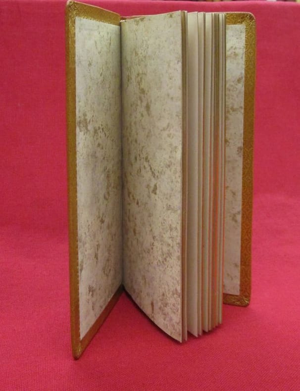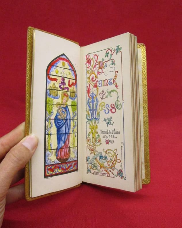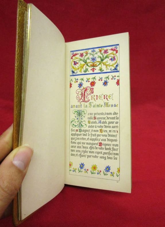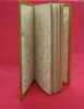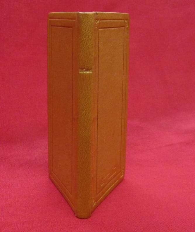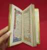 Bouasse Lebel & Massin, Paris, 1892, 1 volume de 80x170 mm environ, 1 frontispice, XLIX pages. Mise en couleurs à la main du frontispice, de la vignette in fine, des encadrements du texte, lettrines. Reliure signée, plein maroquin havane, dos long au titre doré, double encadrement des plats (filet doré et encadrement à froid), monogramme stylisé au bas du plat supérieur, toutes tranches dorées, chasses dorées, gardes de papier décoré doré. Une discrète tache sur le plat supérieur, couture des cahiers apparentes au milieu du volume, bon état général, bel exemplaire.