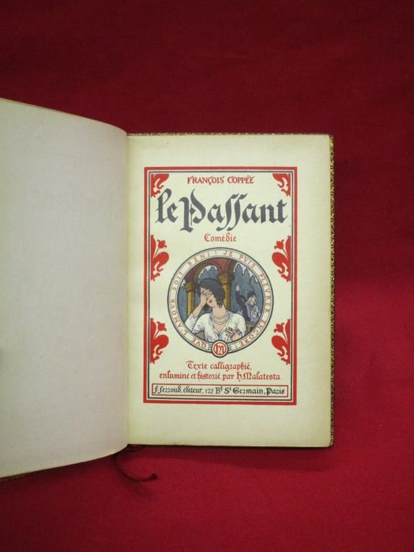 Paris, A Fezzoud librairie des amateurs, 1920 ; in-12, br. Broché en bon état - texe calligraphié enluminé et historié par H. Malatesta - n°1351 FF/1500 exemplaire sur vélin. In-12 broché sous couverture rempliée, sans pagination. Texte calligraphié, enluminé et historié par H. MALATESTA. Tirage limité à 1500 exemplaires, celui-ci un des 1200 sur Vélin ( Comédie en un acte en vers, représentée pour la première fois sur le théâtre National de l'Odéon le 6 janvier 1864.