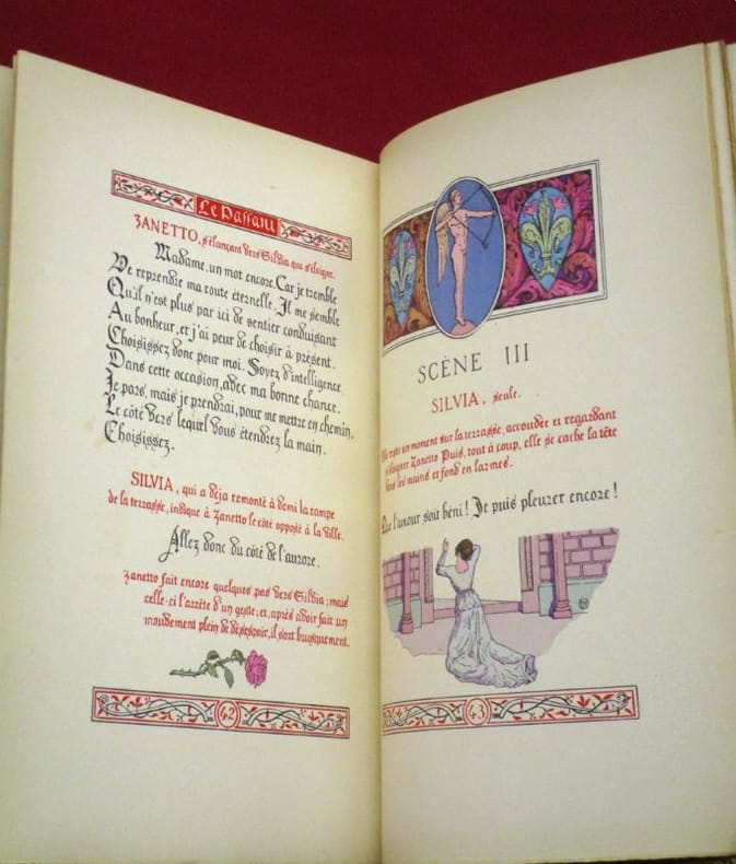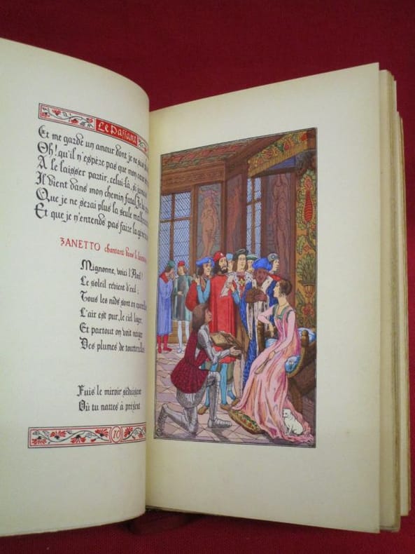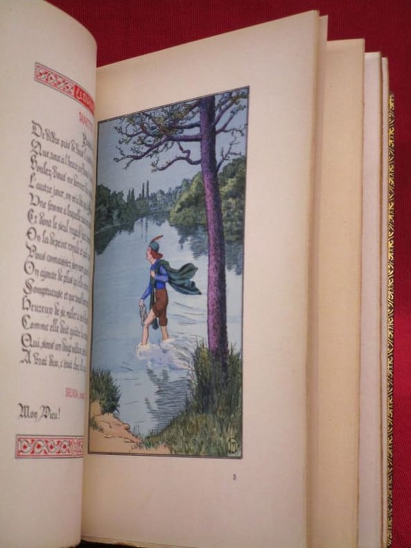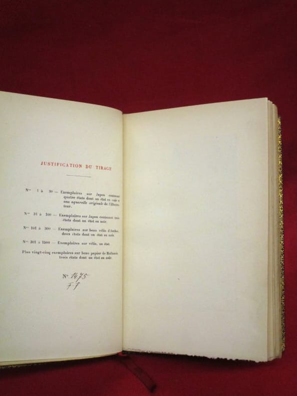 Texte calligraphié, enluminé et historié par H. Malatesta. Ouvrage finement illustré en couleurs de quatre hors-texte, trois en-têtes et culs-de-lampe.Tirage à 1500 exemplaires, celui-ci un des 1200 exemplaires numérotés sur vélin.