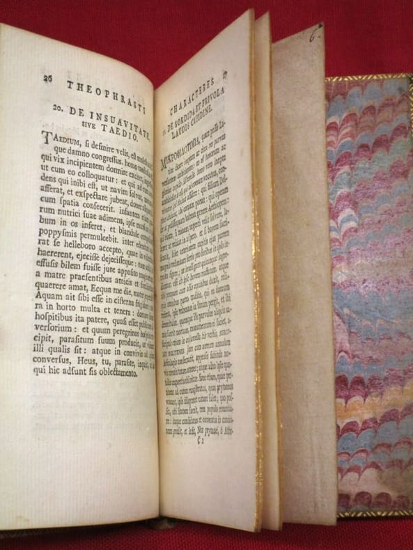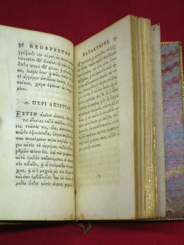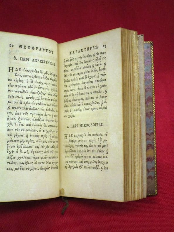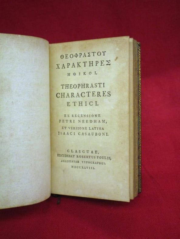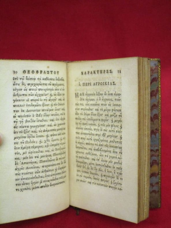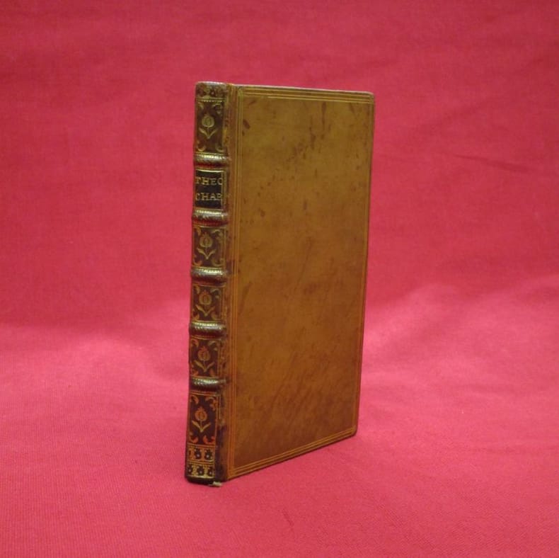 1748 Glasguae [Glasgow], excudebat Robertus Foulis [Robert], 1748, 1 volume in-18 75x130 mm environ, version en grec puis en latin, 52 p., 34 pages. Plein veau glacé, dos à nerfs portant titres dorés, caissons ornés, triple filet doré en encadrement des plats, filet doré sur les coupes, toutes tranches dorées, gardes de papier marbré. Traces d'éclaboussures sur les plats, fendillements sur les mors, quelques traces de mouillures marginales, sinon intérieur frais,bon état général.