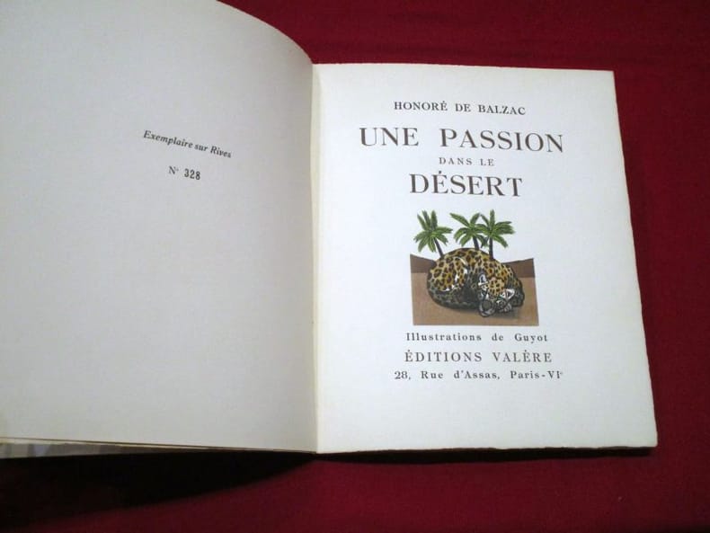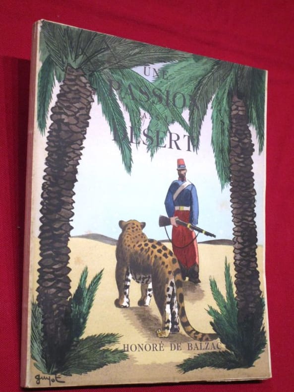 Maxime Cottet-Dumoulin Paris 1949 In-4 carré ( 345 X 270 mm ), en feuilles sous couverture illustrée rempliée, chemise et étui à l'imitation de la peau de serpent. Premier tirage des 13 compositions de Paul JOUVE à pleine page, soit 9 pleine page en couleurs, 3 sur double page en couleur, une pleine page en noir et 54 bandeaux, gravés sur cuivre à l'eau forte par Raymond HAASEN. Tirage unique à 123 exemplaires numérotés sur vélin d'Arches teinté filigrané au nom de l'artiste, celui-ci 1 des 110 enrichis d'une suite en noir des 13 illustrations. Beau livre d'artiste en bel état signé par l'éditeur et Paul JOUVE.- Bibliographie: Marcilhac, Paul Jouve, p. 381.- Exposition: De Balzac à Paul Jouve, "Une passion dans le désert", Musée de la maison de Balzac, Paris, 4 octobre 2007- 6 janvier 2008."Une passion dans le désert" est un texte méconnu de BALZAC, une courte nouvelle, publiée avec un autre roman "Les Chouans". Cette nouvelle évoque "l'amour" d'un soldat napoléonien pour Mignonne, une panthère rencontrée dans le désert lors de la campagne d'Égypte. Cette nouvelle à sa publication provoqua quelques commentaires compte tenu des "troublants" sous entendus qui existent dans le texte.