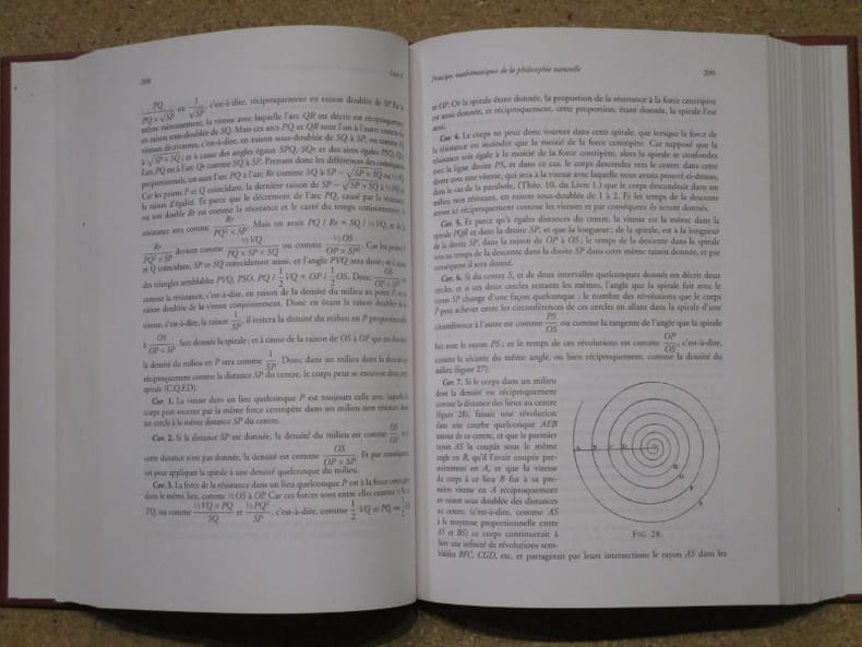 quelques figures dans le texte en noir et blanc 1ere édition, 1987 Contents, Chapitres : 1. Articles : Pierre Costabel : Les Principia de Newton et leurs colonnes d'Hercule - Georges Barthélemy : De la force accélératrice dans les Principia - François de Gandt : Le problème inverse (Prop. 39-41) - Christiane Vilain : Newton et le modèle mécaniste de la réfraction - Michel Blay : Le traitement newtonien du mouvement des projectiles dans les milieux résistants - John Greenberg : Isaac Newton et la théorie de la figure de la Terre - 2. Documentation : Efthymios Nicolaidis : Les livres qui ont introduit les sciences dans le monde grec au Siècle des Lumières - Catherine Chevalley : L'optique des Jésuites et celle des médecins - Jean Dhombres : A l'occasion du bicentenaire de la mort de Leonhard Euler, 1707-1783 - Comptes rendus - En 1687, Isaac Newton publie donc son uvre majeure : Philosophiæ Naturalis Principia Mathematica, (Principes mathématiques de la philosophie naturelle). Cette uvre marque le début de la mathématisation de la physique. En effet, Newton y expose le principe dinertie, la proportionnalité des forces et des accélérations, légalité de laction et de la réaction, les lois du choc, il y étudie le mouvement des fluides, les marées, etc. Mais il expose aussi et surtout sa théorie de lattraction universelle. Les corps sattirent avec une force proportionnelle au produit de leur masse et inversement proportionnelle au carré de la distance qui les sépare. La simplicité et l'efficacité de cette théorie aura une très forte influence sur les autres sciences au xviiie siècle, particulièrement les sciences sociales comme nous le verrons. Toutefois, sur le moment, si le livre est bien accueilli en Grande-Bretagne, sur le continent la réaction est hostile. (source : Wikipedia) couverture à peine jaunie avec quelques rousseurs discrètes, sinon bel exemplaire, intérieur frais et propre - paginé 249 à 415 dont les pages 249 à 366 sur les Principia de Newton (118 pages, et quelques figures)