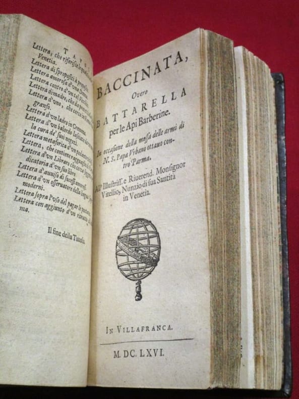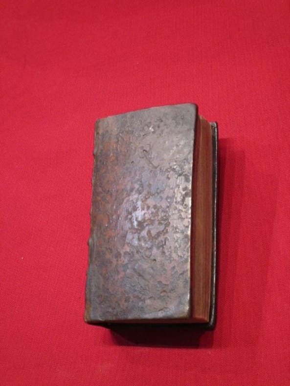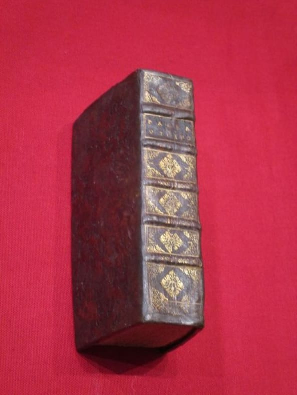 In Villafranca [Amsterdam], [Daniel ELZEVIR], 1666, 1 volume in-12 de 70x130 mm environ, (12) ff., 70 pages, (1) f., 588 pages. Plein cuir granité, dos à nerfs portant titres dorés et caissons ornés, roulette dorée sur les coupes, tranches mouchetées, gardes de papier marbré. Reliure restaurée (coiffes, nerfs, mors et coins), ex libris tamponné sur la page de titre, traces de mouillures sur les 70 premières pages, bon état général.