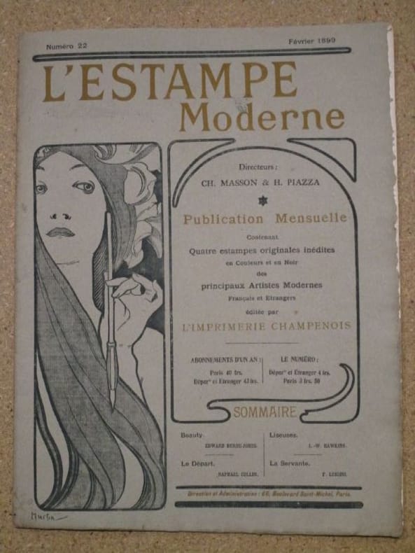Estampe moderne 1899 Imp. Champenois, l'Estampe Moderne, Numéro 22, Février 1899, environ 41x31cm, couverture par Mucha, complet des 4 estampes (2 sont contrecollées à une page plus grande, les 2 autres sont directement imprimées). Couverture un peu salie, les marges des estampes ou le papier sur lequel elles sont contrecollée est piqué, le papier de l'estampe de Burne-Jones porte trace de trous de punaises avec un petit manque dans un coin, de mauvais plis sur les calques avec quelques petites déchirures sur les bords. Bon état pour le reste.