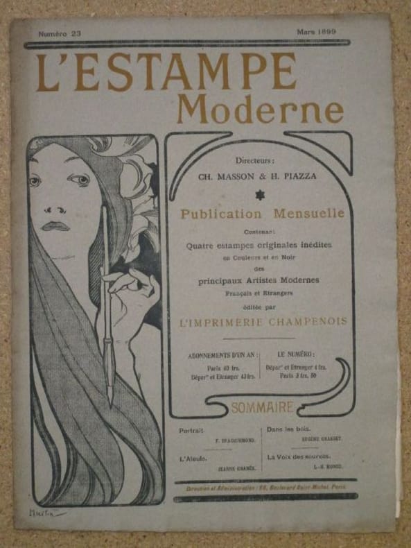 Estampe moderne 1899 Imp. Champenois, l'Estampe Moderne, Numéro 23, Mars 1899, environ 41x31cm, couverture d'après Mucha, complet des 4 estampes (2 sont contrecollées à une page plus grande, les 2 autres sont directement imprimées). Dos en partie fendu, premier plat insolé. Une mouillure dans la marge de l'illustration de Monod. Marges de l'illustrations de Granès piquées. 2 petits trous de punaise et une mouillure en bordure de la page sur laquelle est contrecollée l'illustration de Grasset. Bon état pour le reste.