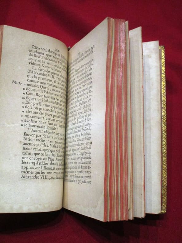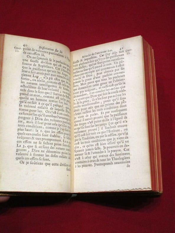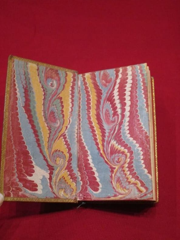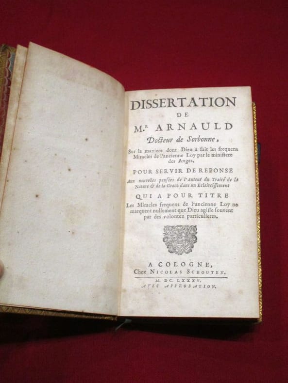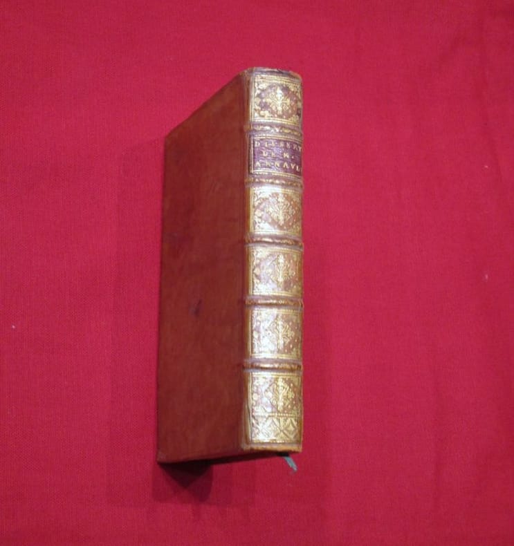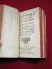 A Cologne, Chez Nicolas Schouten , 1685, 1 volume in-12 de 100x170 mm environ, page de titre, (10) ff., 145 pages, (5) ff., 290, (2) ff. Plein veau glacé, dos à nerfs portant titres dorés sur pièce de cuir rouge, caissons ornés, encadrement des plats à froid, filet doré sur les coupes, chasses dorées, tranches rouges, gardes de papier marbré. Coiffes frottées, mors légèrement épidermés, une tache sur le second plat, quelques rousseurs, mouillures sur la marge inférieure de quelques feuillets, sinon bon état général, agréable exemplaire.