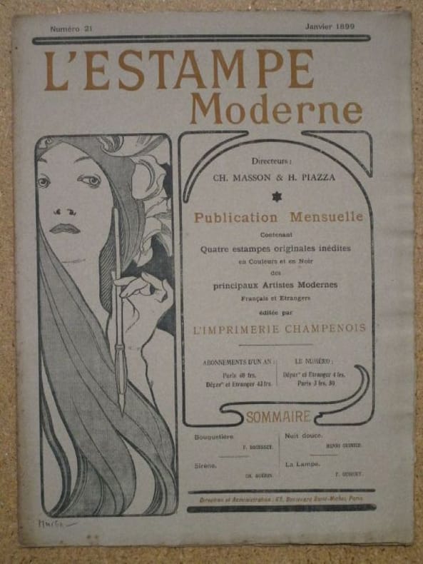 Estampe moderne 1899 Imp. Champenois, l'Estampe Moderne, Numéro 21, Janvier 1899, environ 41x31cm, couverture d'après Mucha, complet des 4 estampes (1 est contrecollée à une page plus grande, les 2 autres sont directement imprimées). Marge des estampes et bord de la couverture un peu piquées. Bon état pour le reste.