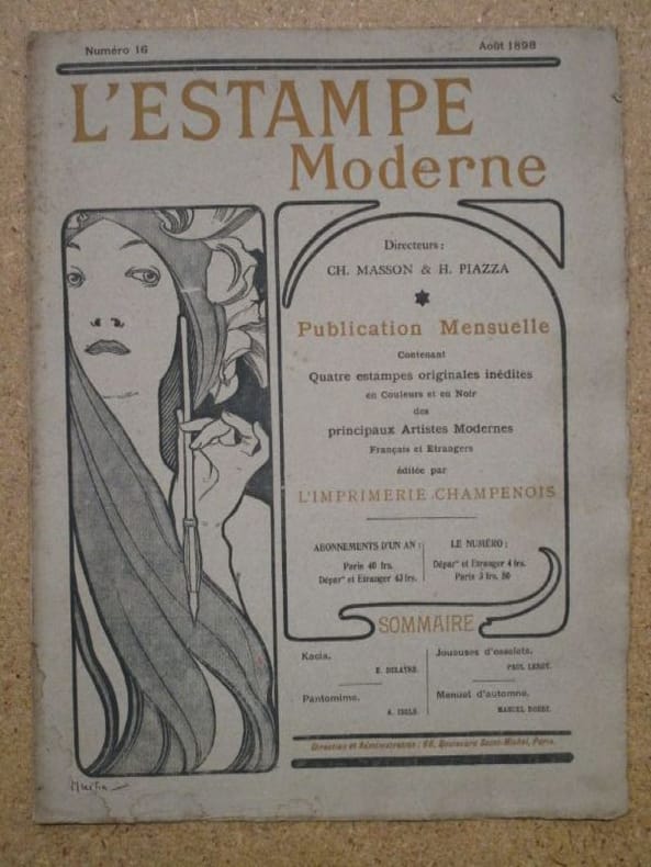Estampe moderne 1898 Imp. Champenois, l'Estampe Moderne, Numéro 16, Août 1898, environ 41x31cm, couverture d'après Mucha, complet des 4 estampes (2 sont contrecollées à une page plus grande, les 2 autres sont directement imprimées). Les calques des Joueuses d'Osselet et de Kacia manquent et sont remplacés par des doublons des deux autres. Petit manque sur l'un des coins de Kacia, bords des pages un peu roussies, des rousseurs et une mouillure sur le premier plat de la couverture. Bon état pour le reste.