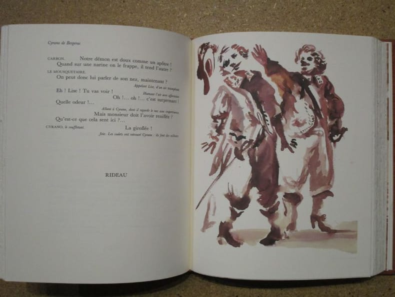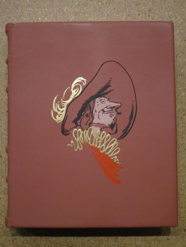 Paris, 1898. 8vo. Contemporary half calf with five raised bands, gilt spine. Single gilt lines to boards. Capitals and corners worn. Inner hinges a bit weak. With Eugen Zabel's book plate to inside of front board, a postcard depicting Edmond Rostand's residense at Cambo, obviously posttamped on verso, pasted on to front free end-paper, contemporary newspaper-clipping about the numerous performances of ""Cyrano von Bergerac"" around the world pasted in to hinge of fly-leaf, where the presentation-inscription (for Eugène Zabel) is written, and finally, the original handwritten address in Rostand's hand, cut out from the envelope in which the book was sent to Zabel, is pased into hinge of half-title. Internally nice and clean.