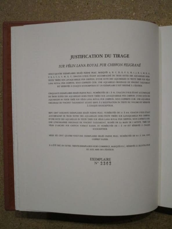 Nouvelle Librairie de France Guy-Victor Labat 1991 Nouvelle Librairie de France, Guy-Victor Labat Editeur, 1991, 291 p., reliure pleine peau éditeur, sous étui, environ 29x23cm, exemplaire numéroté 2363 sur vélin Lana royal pur chiffon filigrané, illustré d'aquarelles de Vincent Tailhardat. Quelques frottements d'usage sur l'étui, des griffures discrètes sur le dos. Bon état néanmoins et intérieur bien propre.