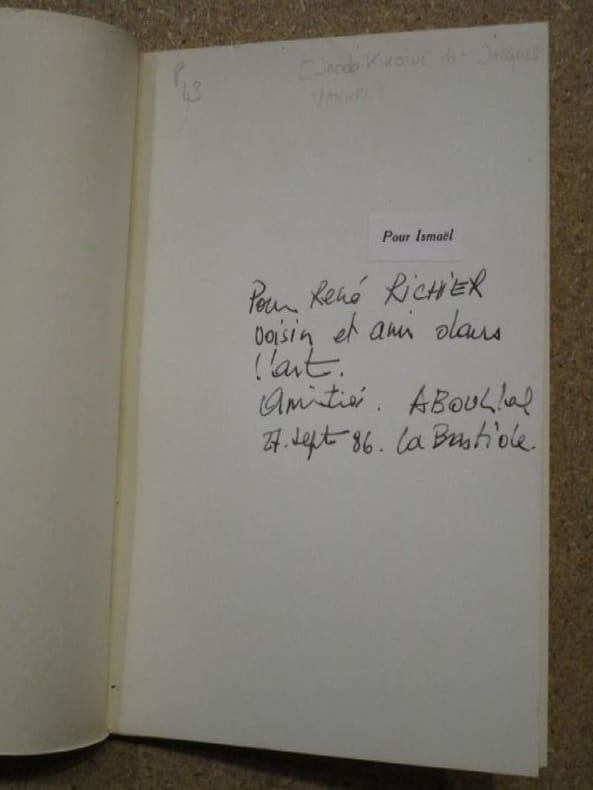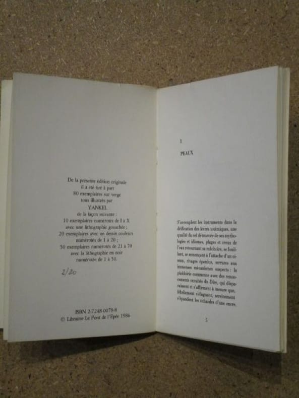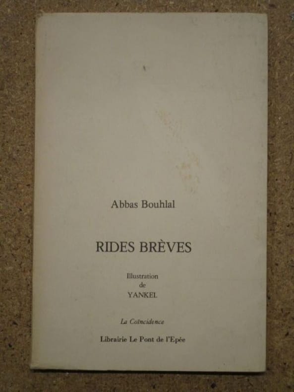 Pont de l'Epée Coïncidence 1986 Librairie le Pont de l'Epée, La Coïncidence, 1986, 52 p., broché, environ 21x14 cm, édition originale tirée à 80 exemplaires sur vergé (notre exemplaire porte le numéro 2/20), avec un dessin couleurs signé de Yankel, avec un envoi d'Abbas Bouhlal. Couverture un peu salie, bords du dessin de Yankel légèrement froissé. Bon état pour le reste et intérieur bien propre, pages non coupées (jamais lu).