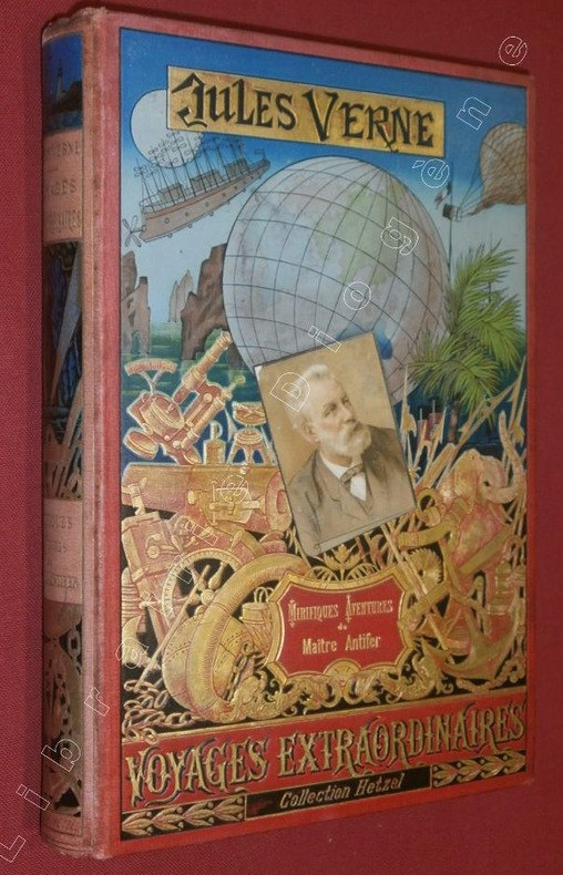 Première édition grand in-8 ornée de 78 illustrations ainsi que de 12 planches en chromotypographie par George Roux et de 2 cartes en couleurs. Cartonnage éditeur Hetzel "au portrait collé" en pleine percaline rouge signé A. Lenègre, premier plat polychrome signé Souze représentant divers moyens de locomotion (ballon, locomotive, bateaux), un portrait de l'auteur dans les tons sépias contrecollé au centre, divers instruments de navigation rehaussés à l'or au premier plan, second plat de type "e" comme indiqué par Jauzac, dos orné de plusieurs illustrations en couleur et à l'or, pages de garde bleues d'origines, un coin supérieur pincé, toutes tranches dorées. Catalogue HF in-fine. Quelques petites rousseurs. Aventures maritimes qui racontent une chasse au trésor, menant le héros de la Tunisie au golfe de Guinée, puis en Ecosse, à l'île de Spitzberg, et enfin en Sicile. - Photographies et détails sur www.Edition-Originale.com -