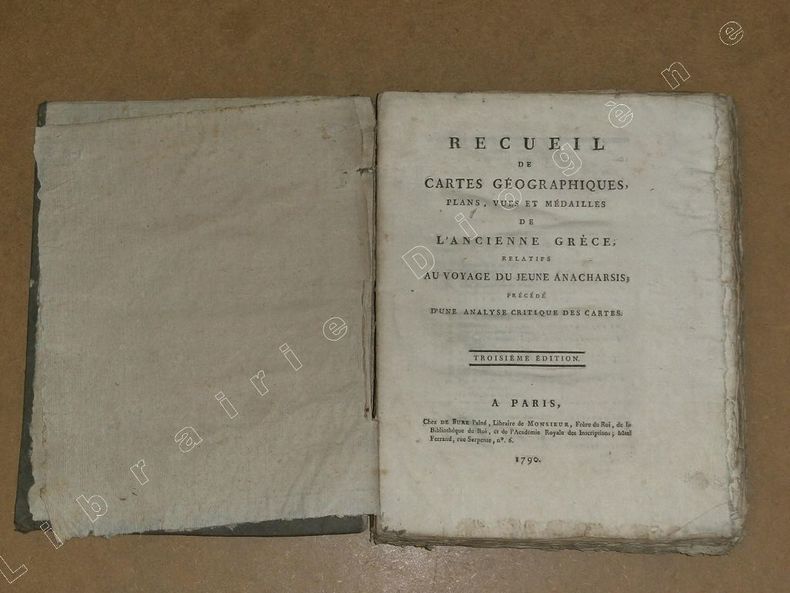 Paris Chez de Bure L'aine 1790 Pour accompagner « Voyage du jeune Anacharsis en Grèce » de Barthélemy. Couverture rigide contemporaine recouverte de papier marbré. La couverture est frottée et décolorée. À l'intérieur, quelques légères rousseurs. Les pages sont en bon état, sans déchirures ni plis. XXXII pages de texte, suivies de [31] feuilles de planches : illustrations en noir et blanc, cartes dépliantes et plans. Complet. Barbie du Bocage fait référence à Jean-Denis Barbié du Bocage (1760-1825), géographe et cartographe français de renom. Il fut l'élève du célèbre géographe Jean-Baptiste Bourguignon d'Anville et travailla longuement à Paris. Jean-Denis Barbié du Bocage a occupé des fonctions importantes, notamment celle d'attaché au ministère des Affaires étrangères, puis au Cabinet des médailles de la Bibliothèque du Roi. Il a contribué aux connaissances géographiques et cartographiques à la fin du XVIIIe et au début du XIXe siècle, en créant des cartes telles que celles du « Voyage du jeune Anacharsis ». Il a également servi sous l'administration de Napoléon et était membre de l'Institut de France. 26 cm x 21 cm. Conforme à la troisième édition référencée dans WorldCat / OCLC : 8182752.
