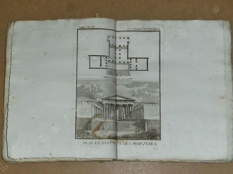 Seconde édition, illustrée de 31 planches sur double page montées sur onglets dont 29 cartes et plans (16 dépliantes) dont 11 rehaussés en couleurs ; la première édition datant de 1788.XLI pages pour l'analyse des cartes. Reliure en plein velin vert d'époque. Dos à nerfs janséniste. Pièce de titre en maroquin rouge. 2 coins adroitement restaurés et petite restauration sur les 2 premiers nerfs. Très bel exemplaire. Bel atlas qui, outre la carte coloriée de la grande Grèce et ses îles donne les cartes des différentes provinces, Le plan d'Athènes, l'élévation des principaux monuments (Parthénon, Théâtre grec, maison grecque...), certaines grandes batailles. Il fut à l'origine conçu pour accompagner le Voyage du jeune Anacharsis de l'abbé Barthélémy, fantaisie romanesque d'un jeune philosophe voyageant dans la Grèce antique au IVe siècle avant J.C. Il était vendu à part ou avec la collection des 5 volumes du roman. - Photographies et détails sur www.Edition-Originale.com -