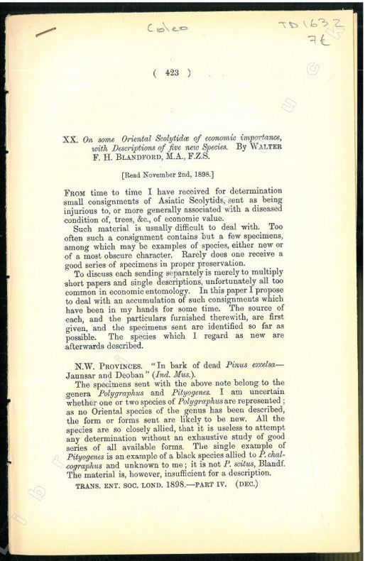 1898 Trans.ent.Soc.London, Part IV, 1898 : in-8, broché extrait, pp. 423-430. Très bon état !