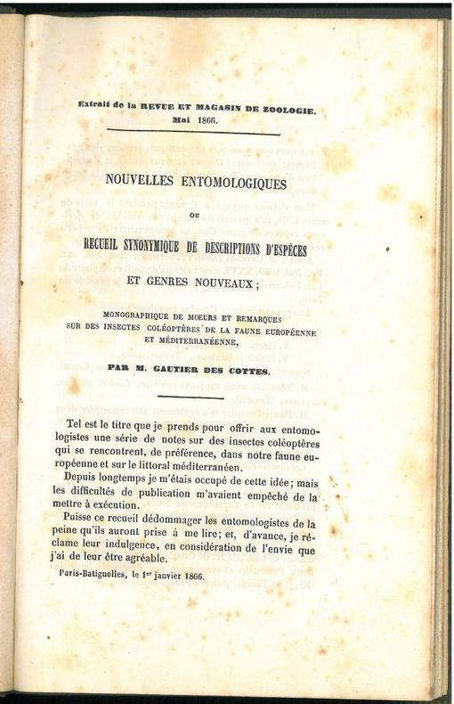 1866 Revue et Magasin de zoologie, 1866 : In-8 Carré, Relié demi-cuir. pp. 1-35, pp. 257-264 : suivi de Chevrolat A. : "description de deux Dorcadion nouveaux", pp. 1-3 : et Stierlin G. : "Zweiter Nachtrag zur Revision des europäischen Otiorhynchus-Arten, pp. 129-133 : demi-chagrin brun avec plats de toile grenée, titrage doré sur le 1° plat Bon état, Couv. convenable, Dos satisfaisant, Quelques rousseurs.