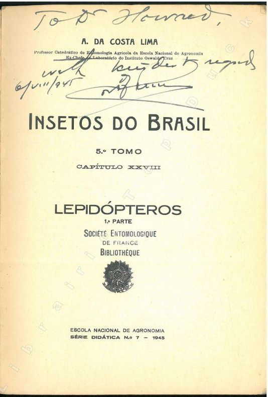 1945 Rio de Janeiro, Escola Nacional de Agronomia, 1945 : in-8, broché 379 pp., 235 figures in-texte, couverture crème illustrée. Bon état, couverture défraichie, dos abimé avec petit manque, envoi de l'auteur au Dr. ??? en page de titre, cachet de bibliothèque !