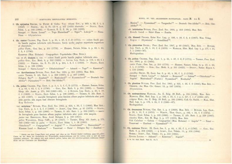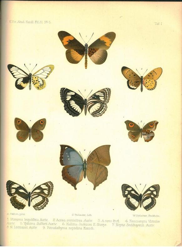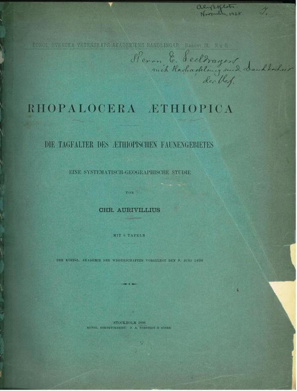 1898 K.svenska VetenskAkad.Handl., Bandet 31, n° 5, Stockholm, 1898 : In-4 Cavalier, Relié toilé. 561 pp., 6 planches couleurs hors-texte très fraiches, 41 figures in-texte, pleine toile vert sapin (? éditeur), couvertures conservées (petit manque en marge des plats), envoi de l'auteur à Emile Seeldrayers sur le 1° plat, coiffes légèrement frottées et petites rayures sans gravité sur les plats de la reliure, ouvrage recherché sur les papillons diurnes africains ! Très bon état, Couv. convenable, Dos satisfaisant, Quelques rousseurs.