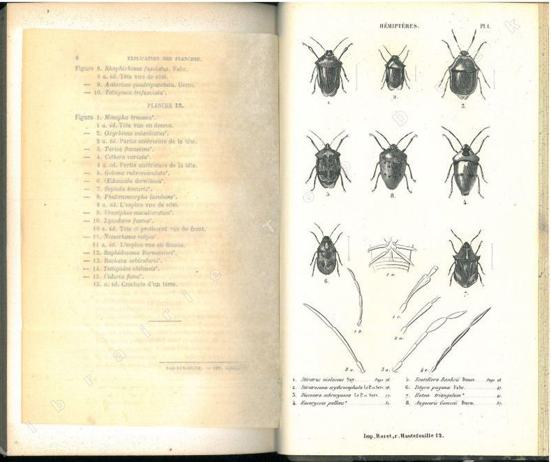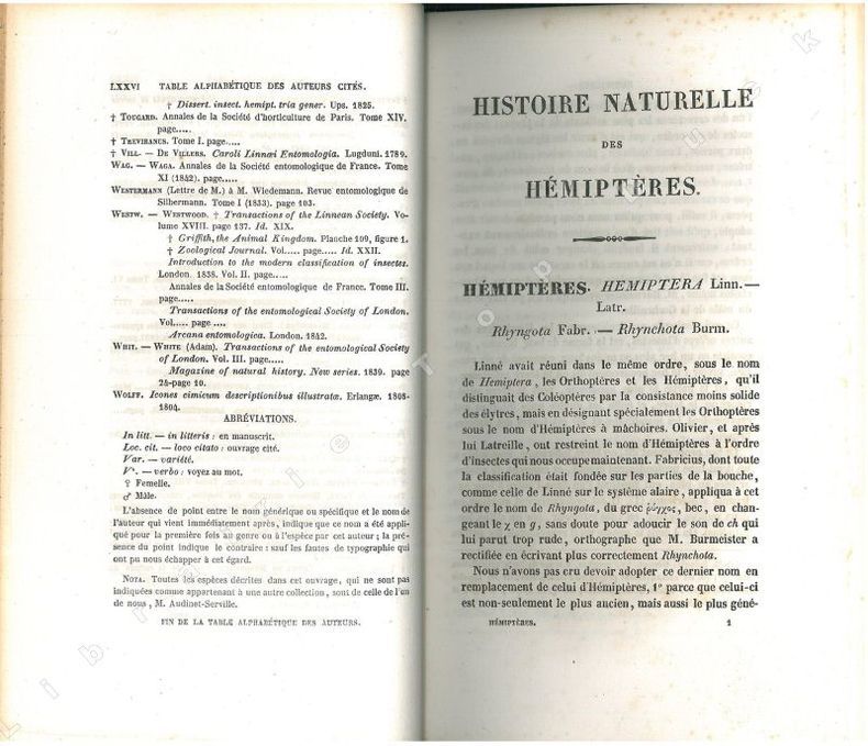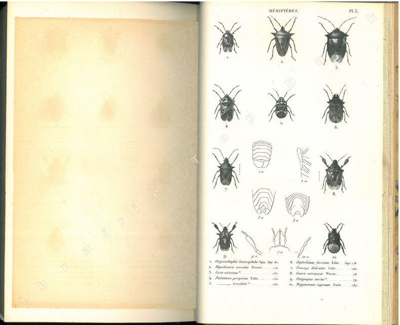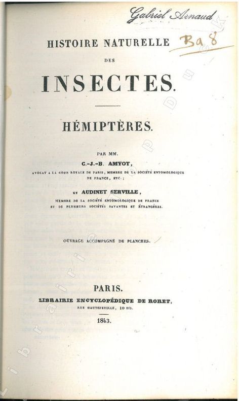 1843 lxxvi, 675, [1], 6 p., 12 beautifully hand-coloured pls, contemporary green hcalf (spine gilt, black labels). Some scattered slight foxing in the text, plates clean. Ex library Claude Gouffé.This is Charles Jean Baptise Amyot (1799-1866) and Jean Guillaume Audinet-Serville's (1775-1858) most important work in the field of Hemiptera, and was published by Librairie Encyclopédique de Roret as part of the ''Suites à Buffon''. This is a very good copy of one of the rarer volumes in the series. Furthermore it is the scarce coloured edition in an beautiful period binding.