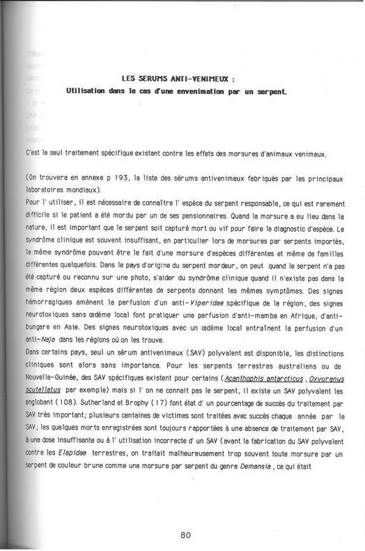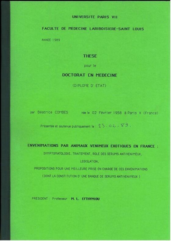 1989 Paris, Faculté de Médecine, 1989 : In-4 Carré, Broché. thèse, 218 pp. xviii, contient : symptomatologie, traitement, role des sérums antivenimeux, législation, ... Etat du neuf, Couv. remarquable, Dos impeccable, Intérieur frais.