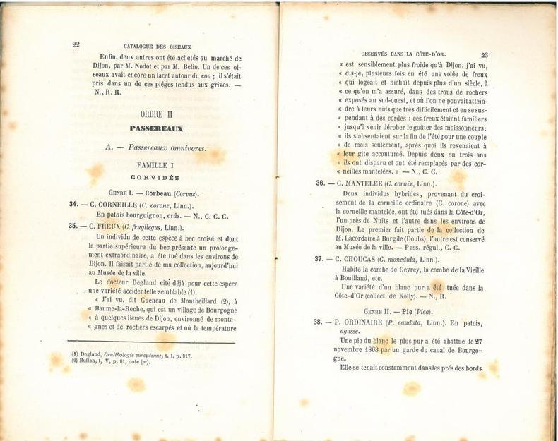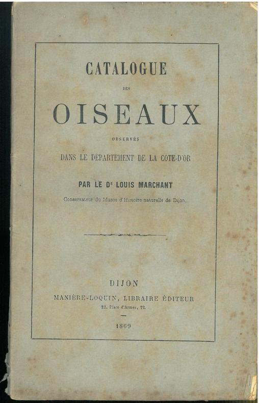 1869 Dijon, Manière-Loquin, 1869 : In-8 Carré, Broché. tirage limité à 250 exemplaires, 92 pp., extrait des Mémoires de l'Académie de Dijon, tome XV, 1868, rare avifaune régionale ! Très bon état, Couv. fraîche, Coiffe en pied abîmée, Quelques rousseurs.