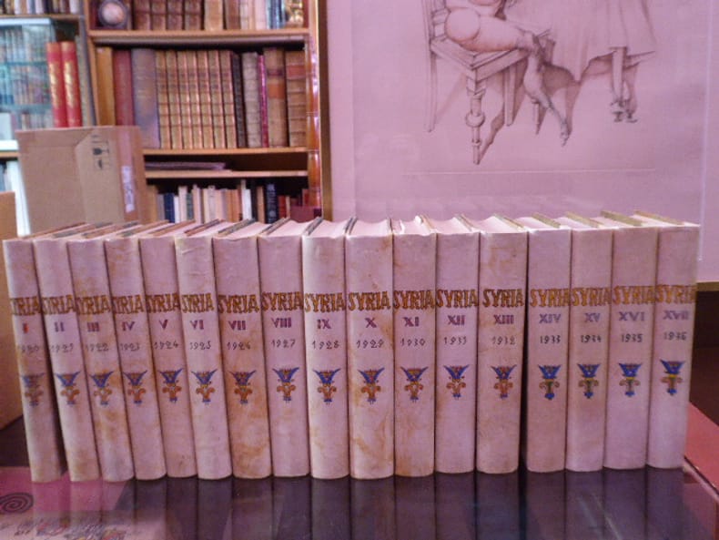 Librairie Orientaliste Paul Geuthner Paris 1920-1936 68 fascicules en 17 volumes in-4 carré ( 280 X 225 mm ) d'environ 400 pages par volume, reliures de lépoque, demi-vélin crème parcheminée, dos lisses titrés et ornés à la main à la gouache et à l'aquarelle, plats habillés dun papier froissé verni, formant des nervures polychromes. Tête de collection de cette importante revue comprenant les premiers tomes, du tome I de 1920 au tome XVII de 1936 ( 4 fascicules par volume ). Très importante iconographie , très nombreuses figures dans le texte, 1110 planches en héliogravure hors-texte en couleurs et en noir. Superbe ensemble sans manques, en parfaite condition.Quelques titres des sujets traités ( liste non exhaustive ) pour se rendre compte de la richesse et de l'érudition des contributions..- Tome IX ( 1928 ). Byblos, Qatna, Céramiques Musulmans de Suse, Les Hyksos, L'Egyptien à Beyrouth, 2 Sanctuaires Chiite Alep... - Tome XI ( 1930 ). Nouvelle Inscription Découverte à Byblos, Cylindre Syro-Egyptien, Mission Archéologique en Haute Djezire, Citadelle de Damas, Peintures Assyriennes, Campagne de Fouilles à Qatna et Byblos, Carte Touristique de Caza de Harem... - Tome XIV ( 1933 ). Les Fouilles de Tepe-Giyan, Les Numeris Syriens, Le Rôle de L'Art de la Syrie et de la Mésopotamie, La Naissance des Dieux Gracieux et Beaux, Tadmorea, Le Déchiffrement des Hiéroglyphes Hittites, Deux Monuments des Cultes Solaires, Restaurations à Palmyre... - Tome XV ( 1934 ). l'Expédition de Ctésiphon en 1931-32, Fragments d'Un Traité Phénicien, Ras-Shamra, Poème de Aleyn-Baal, l'Exposition de Miniature Musulmane, La Mort de Baal, Antiquités Syriennes, Sarcophages du Musée National Libanais, Indigènes et Croises... - Tome XVI ( 1935 ). Les Fouilles de Mari, La Révolte de Koser Contre Baal, Le Château de Saône, Les Fouilles de Tepe-SialkLes Chasse de Baal, Tissus et Tapisseries du Musée Arabe du Caire, 4 Fragments Alphabétiques / Une Lettre Assyrienne Trouves à Ras Shamra, Les Éléments Déchainés, La Deuxième Campagne de Fouilles à Ay, L'Art Néolithique à Jéricho, Grilles de Fenêtres en Egypte, Motifs et Symboles du IV millénaire...