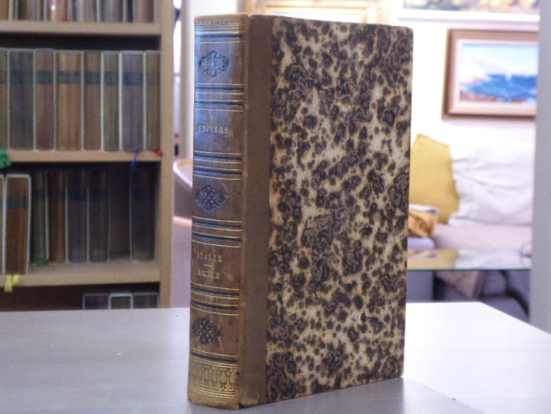 Paris, Firmin Didot Frères, Éditeurs, 1835 ; in-8, 8-384-96 pp. + 2 cartes dépliantes, 96 pl. sur l'Italie, 24 pl. sur la Sicile hors-texte, cartonnage d'éditeur illustré (fatigué, nombreuses rousseurs). Collection: l'Univers«Histoire et description de tous les peuples». Le texte sur l'Italie est de M. Artaud, le texte sur la Sicile est de M. La Salle. Illustré de gravures en taille-douce, exécutées par divers graveurs. État moyen.