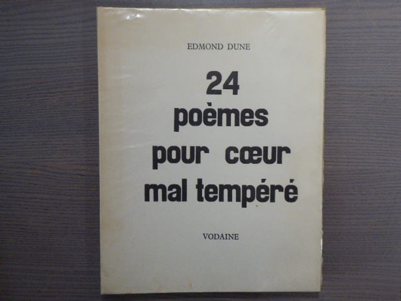 Chez Vodaine 1967 In4 DUNE (Edmond) - 24 poèmes pour cour mal tempéré. 6 gravures de Jean Vodaine - Basse-Yutz, chez Vodaine, 1967 - in4 en feuilles sous chemise rempliée 80pp - Tirage à 150 ex. celui-ci H. C. - Envoi d'Edmond Dune en page de faux-titre à Luc Bérimont (écrivain poète français 1915-1983 )- Importante décharge rousse en pages 14 et 15 n'entamant pas le texte, dos de la chemise fragile .Edmond Dune (1914-1988) fut un génial auteur : théâtre, poésie, romans, traductions . Né en Belgique, il se fixa au Luxembourg après la 2nde guerre. BON ETAT