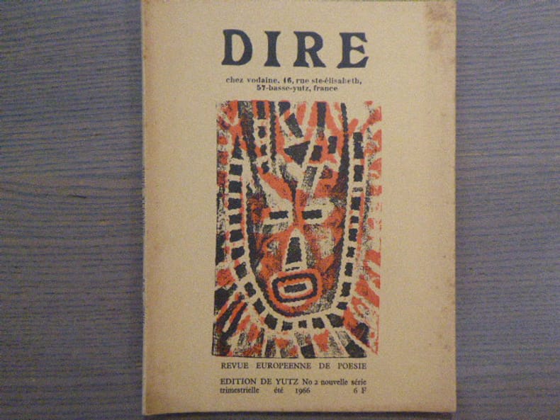 Baslieux Vodaine 1984 Grand In8 - imprimé sur papier kraft - plis a la chinoise - ni sommaire , ni pagination - Dernier numéro de cette revue qui commençât en 1962 . Jean Vodaine est né le 6 juillet 1921 à Volce, aujourd'hui en Slovénie, alors en Vénitie Julienne. A trois ans, sa famille, la famille Kaucic, s'installe en Moselle. Il obtient le Certificat d'études en juin 1933 et un C.A.P. de cordonnier en 1938. En 1947, il publie Rose et noir, son premier recueil poétique, et se marie. Il entreprend une correspondance avec Gaston Chaissac et Jean Dubuffet. En 1951, il lance avec Edmond Dune le Courrier de Poésie. Il travaille comme manoeuvre aux hauts-fourneaux de Thionville (1951-1953). Puis il devient secrétaire de Bruno Durocher (Editions Caractères) à Paris et rencontre de nombreux poètes (1954-1955). Courant 1955, il revient à Basse-Yutz. Ouvrier électricien, comptable de chantier, aide-métreur à l'Alsthom, il effectue des déplacements sur les voies ferrées. Un nouveau recueil, Les Pauvres Heures, paraît en 1955. Trois ans plus tard, il lance la revue La Tour aux Puces (1958) ; mais il est bientôt victime d'un accident du travail (1960). En 1962, il publie le premier numéro de la revue Dire. Au Mas de la Greffe à Montpellier (1964-1966), il poursuit cette publication qu'il imprime lui-même, puis il revient à Basse-Yutz. En 1969, il présente une exposition rétrospective de son travail graphique, Drôles d'Oiseaux, à Basse-Yutz. Il commence à imprimer plusieurs livres. La Fable des animaux restés seuls sur terre, de Jean Vodaine, est remise à Georges Pompidou par le maire de Metz. Il donne des cours à l'école des Beaux-Arts et des Arts Appliqués de Metz et divorce (1972). Il s'installe alors rue des Allemands, à Metz, dans une ancienne cordonnerie, et lance le projet d'une Maison de la Poésie (1973) qui n'aboutira pas. Il publie Sérénade pour un chien endormi et présente une rétrospective de son travail graphique à Pont-à-Mousson. La revue Dire cesse d'être publié en 1984. En 1985, il publie Maixines. Il obtient enfin la nationalité française. Il vit alors dans un petit village du nord de la Meurthe-et-Moselle. Le 8 août 2006, à l'âge de 85 ans, il décéde dans une maison de retraite de Pont-à-Mousson.