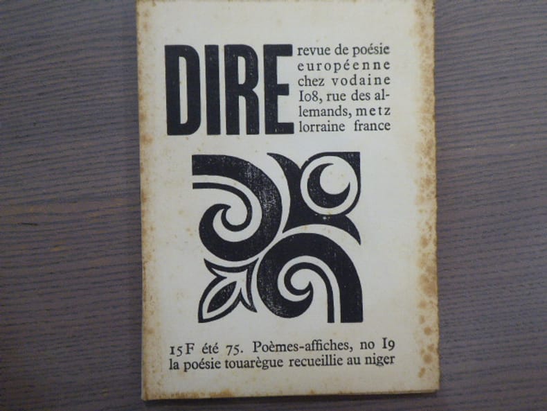 Vodaine Metz 1975 In-8 en feuilles ( 240 x 180 mn ) sous couverture illustrée par Jean VODAINE. Édition originale. Numéro entièrement composé de poèmes-affiches, consacré à la poésie touarègue, recueillie au Niger. Rousseurs sur les marges, bon exemplaire.