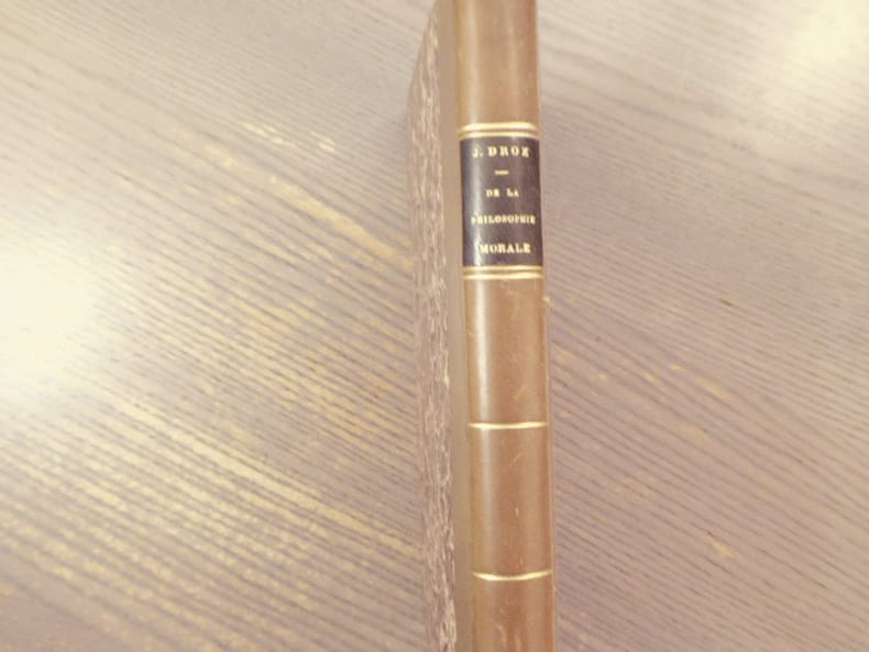 Chez Antoine-Augustin Renouard Paris 1823 In-8 ( 210 X 130 mm ) de 300 pages, demi basane, étiquette maroquinée noire, dos lisse orné de filets dorés, haut du dos frotté, rousseurs passim, bon exemplaire.I - Des diverses acceptions du mot philosophie. II - Du rang que la morale doit avoir parmi les sciences. III - Importance des études morales dans la situation actuelle de l'Europe. IV - .etc. ( 20 chapitres ).
