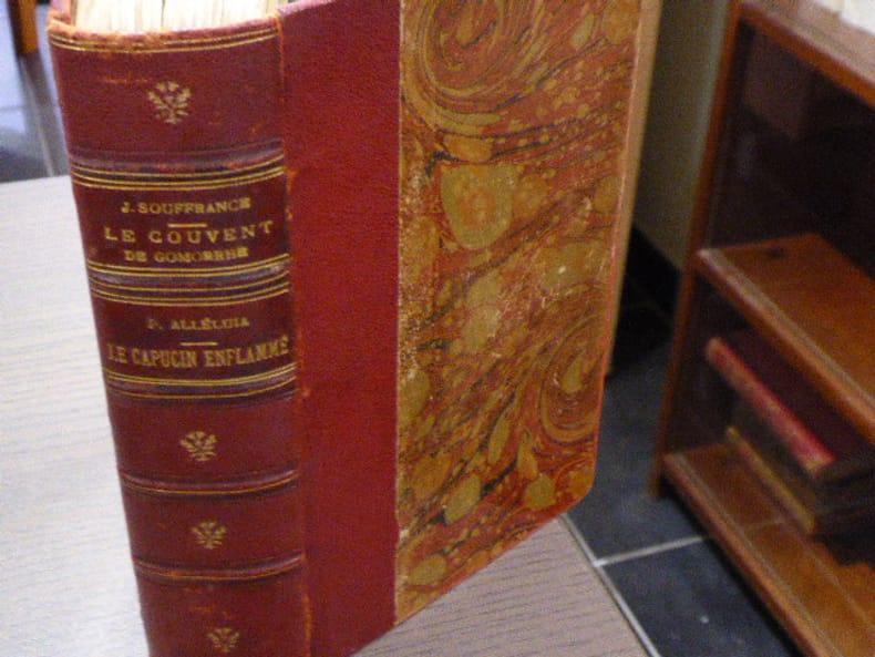 P. Fort Paris S.D. 2 ouvrages reliés en 1 in-8 ( 180 X 120 mm ),I. Le Couvent de Gomorrhe de 280 pages, II. Le Capucin enflammé par le R. P. ALLELUIA de 249 pages, demi chagrin grenat, dos à nerfs ornés de fleurons dorés. Illustrations hors-texte. Bon exemplaire.
