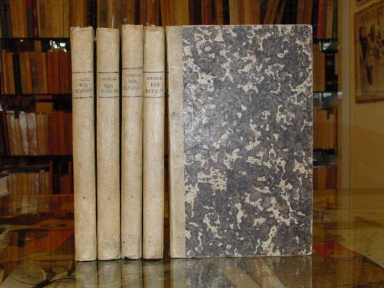S.N. S.L. 1832 5 volumes grand in-8 ( 270 X 165 mm ) de 384 384 384 388 et 384 pages, demi-vélin, plats de papier marbré, dos lisses jansénistes, titre et tomaison inscrits en noir. Trés nombreuses illustrations dans et hors-texte. Tête de collection, chaque volume représente une année complète de publication. Presque tous les écrivains qui pendant cette période ont écrit pour l'enfance ont collaborés à ce périodique célébre, ont notemment paru pour la première fois "Les aventures de Jean-Paul CHOPPART" avec les dessins de GRANDVILLE ( GUMUCHIAN I 6143 ). Beaux exemplaires sans aucune rousseur.