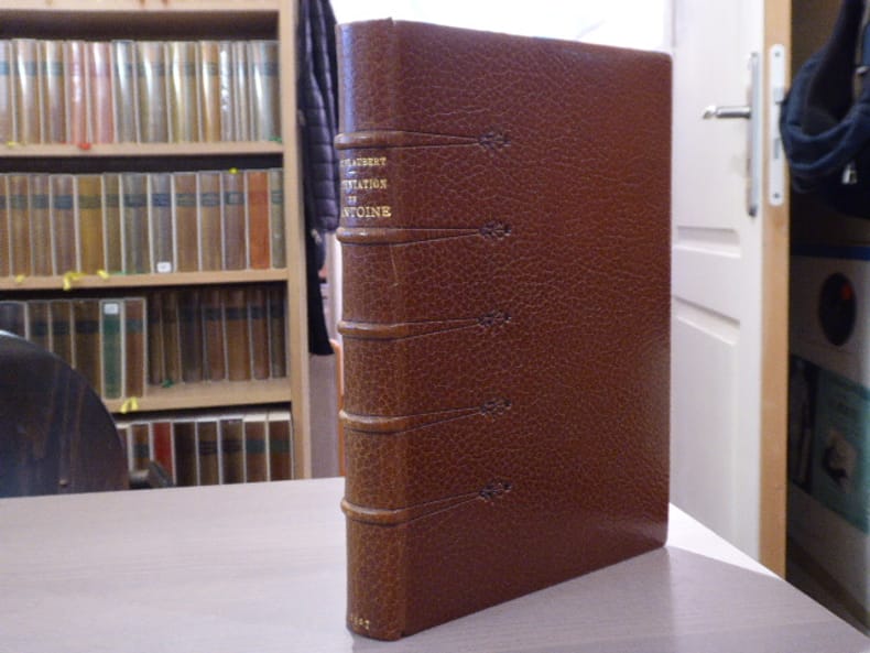 A. Ferroud - F. Ferroud Paris 1907 Grand in-8 ( 280 x 205 mm ) de 213 pages, plein maroquin chocolat à gros grains, dos à nerfs janséniste débordant sur les plats avec décors à froid, doubles filets dorés sur les coupes et les coiffes, tranches dorées sur marbrures. Doublures de maroquin tabac: sur la première figure une mosaïque représentant SAINTE-ANTOINE agenouillé devant une croix et la diable sous les traits d'une femme, dans un encadrement de filets dorés avec des pieuvres mosaïquées à chaque coin. La seconde doublure figure un CHRIST rayonnant surmonté d'une croix avec également des pieuvres mosaïquées. Double gardes de soie moirées, étui bordé. Couvertures originales conservées. Magnifique édition illustrée des compositions symbolistes de ROCHEGROSSE gravées en couleurs par Decisy dans et hors-texte. Un des 230 exemplaires numéroté sur vélin d'Arches. Très bel exemplaire magistralement relié par un Maître.