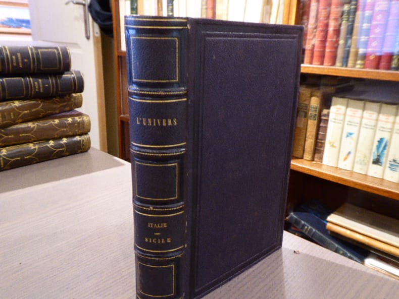 Deux parties en un vol. in-8 rel. demi-basane vert bronze époque à petits coins, dos lisses, titres et filets dorés, fleurons à froid, tranches marbrées, 384-96 pp. sur deux colonnes, 2 cartes dépliantes ,120 planches de gravures, la plupart par Lemaitre et Ollivier. Coins émoussés, quelques rousseurs, bonne condition. Italie, par M. le chevalier Arthaud, 384 pp., 96 planches. Sicile, par M. de la Salle, 96 pp., 24 planches