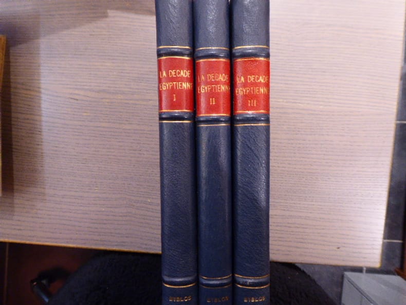 L Imprimerie Nationale Caire S.D. In-8 ( 215 X 160 mm ), de 300 - 300 - 316 pages, demi chagrin bleu nuit, dos à nerfs ornés de filets dorés avec étiquette de titre maroquiné fraise. Impression anastatique de l'édition "Au Kaire", de "l'Imprimerie Nationale", en VIII de la République Française ( 1800 ). Bons exemplaires.