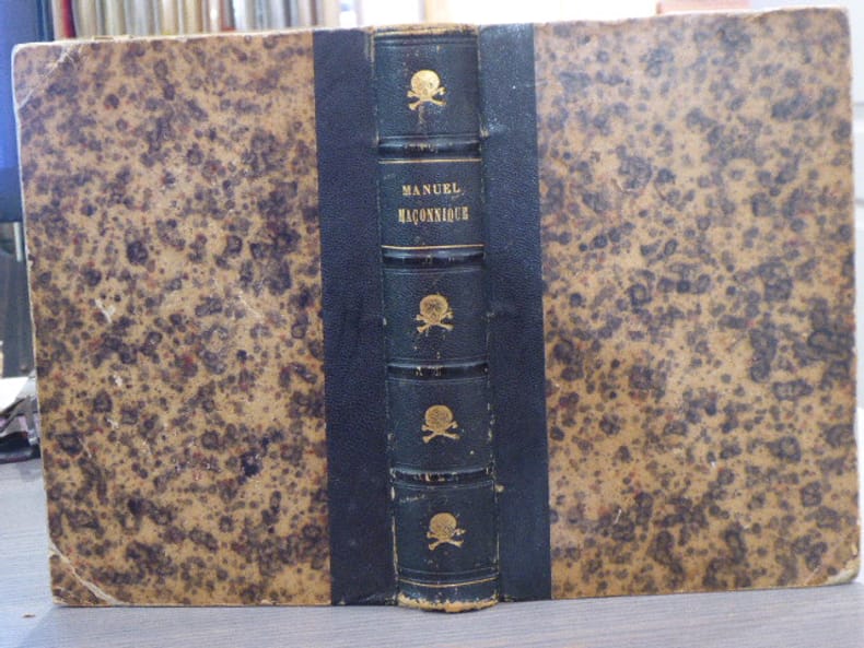 Chez Hubert - Chez Brun Paris 1820 MANUEL MACONNIQUE ou TUILEUR de tous les rites de maçonnerie pratiqués en France dans lequel on trouve l'étymologie et l'interprétation des mots et des noms mystérieux de tous les grades qui composent les différens rites précédés d'un abrégé des règles de la prononciation de la langue hébraïque, dont presque tous les mots sont empruntés, et suivi du calendrier lunaire des Hébreux, à l'usage des institutions maçonniques, avec 32 planches PAR UN VETERAN DE LA MACONNERIE.In-8 ( 210 X 135 mm ) de VIII-455 pages, demi-chagrin anthracite, dos à nerfs orné de têtes de mort dorées dans les caissons. 12 planches hors-texte. Coiffes, coins et coupes frottés, petit manque marginal à la page de titre, bon exemplaire de cet ouvrage fort rare, dans une reluire maçonnique.