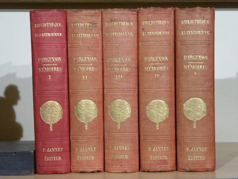 Edition recherchée en partie originale, tirée sur papier vergé. Ami de Voltaire et favorable aux encyclopédistes ces "Mémoires" sont un document pour l'histoire des idées et des moeurs au XVIIIe siècle. Le style en est vivant au point qu'on a cru pouvoir le rapprocher de celui de Saint-Simon. Une partie de la correspondance est publiée d'après les originaux. Index des noms et des matières au tome V. (Ex-libris de la famille Gourio de Lannoster (Bretagne). Excellent état.