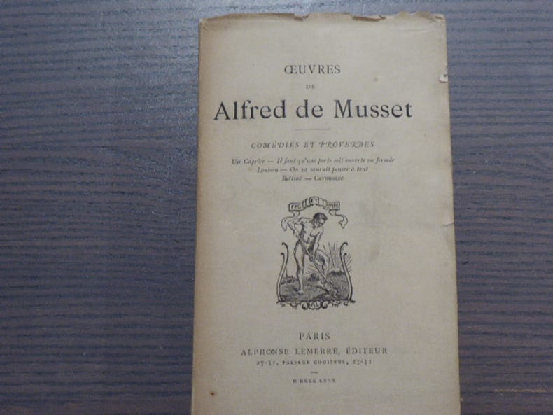 Illustrations de Henri Pille, gravées à l'eau-forte par Louis Monziès, 3 vol. in-12 reliure demi-maroquin à coins orange sous chemise de demi-maroquin à bandes orange, dos à 2 nerfs dorés, couv. et dos conservés, reliure signée de D. Y. Tixier, Oeuvres complètes de Alfred de Musset, Librairie Alphonse Lemerre, Paris, s.d. [ circa 1920 ]. Rappel des titres : Oeuvres de Alfred de Musset. Comédies et Proverbes (3 Tomes - Complet) I : La Nuit vénitienne - André del Sarto - Les Caprices de Marianne - Fantasio - On en badine pas avec l'Amour - Barberine ; II : Un Caprice - Il faut qu'une porte soit ouverte ou fermée - Louison - On ne saurait penser à tout - Carmosine - Bettine ; III : Lorenzaccio - Le Chandelier - Il ne faut jurer de rien